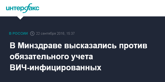 Москва. 22 сентября. INTERFAX.RU - Минздрав России не поддерживает идею обязательной постановки ВИЧ-инфицированных на учет, сообщает официальный представитель ведомства Олег Салагай.