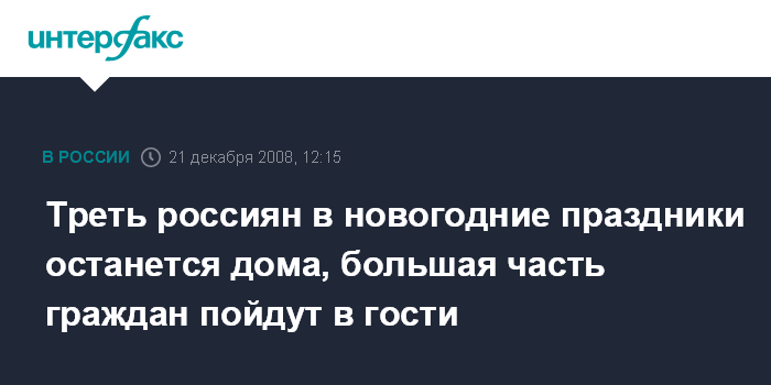 Москва. 21 декабря. INTERFAX.RU - Предстоящие новогодние каникулы собираются провести дома больше россиян, чем заявляли о таких планах респонденты в прошлом году, выяснили социологи.