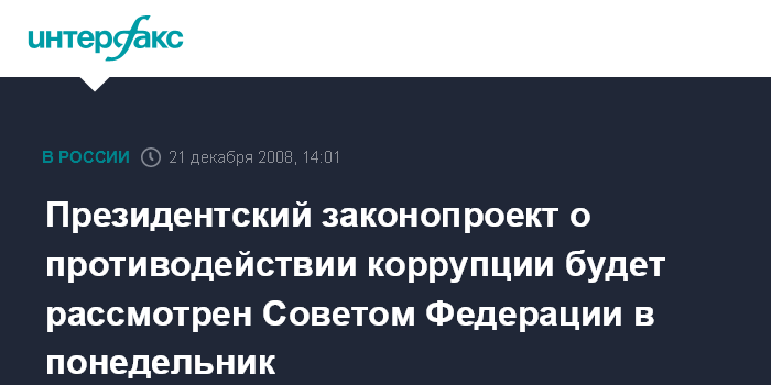 Президентский законопроект о противодействии коррупции будет рассмотрен Советом Федерации в понедельник