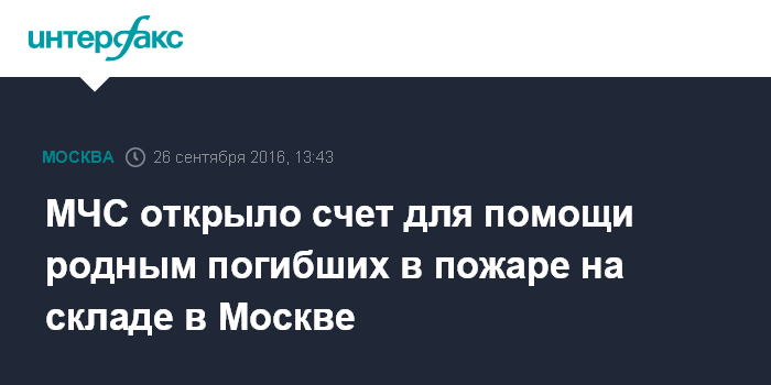 Москва. 26 сентября. INTERFAX.RU - МЧС России открыло счет для оказания помощи родным пожарных, погибших во время тушения пожара на складе в Москве.