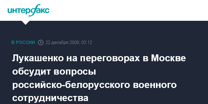 Москва. 22 декабря. ИНТЕРФАКС-АВН - Президент Белоруссии Александр Лукашенко в ходе планирующихся на понедельник переговоров в Москве намерен обсудить вопросы двустороннего военного и военно-технического сотрудничества, сообщил "Интерфаксу-АВН" военно-дипломатический источник в российской столице.