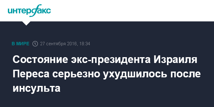 Москва. 27 сентября. INTERFAX.RU - Врачи сообщили о резком ухудшении состояния 93-летнего бывшего президента Израиля Шимона Переса, который две недели назад перенес инсульт.