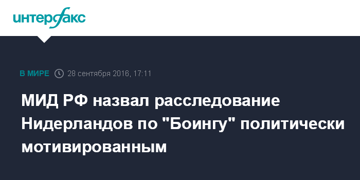 Москва. 28 сентября. INTERFAX.RU - Москва считает предвзятыми и политически мотивированным выводы прокуратуры Нидерландов по расследованию катастрофы рейса MH17 над Украиной, заявили в МИД РФ.