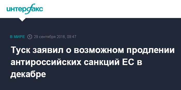 Москва. 29 сентября. INTERFAX.RU - Председатель Европейского Совета Дональд Туск рассчитывает на продление санкций ЕС против России в декабре.