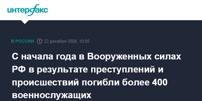 Москва. 22 декабря. INTERFAX.RU - В Вооруженных силах Российской Федерации за одиннадцать месяцев 2008 г. в результате происшествий и преступлений погибло 427 военнослужащих, сообщает управление пресс-службы и информации Минобороны РФ.