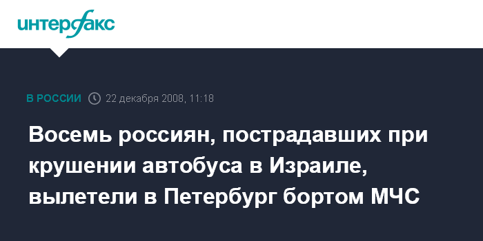 Москва. 22 декабря. INTERFAX.RU - Самолет Ил-76 МЧС России с пострадавшими в результате ДТП в Израиле вылетел в понедельник из Тель-Авива в Санкт-Петербург.