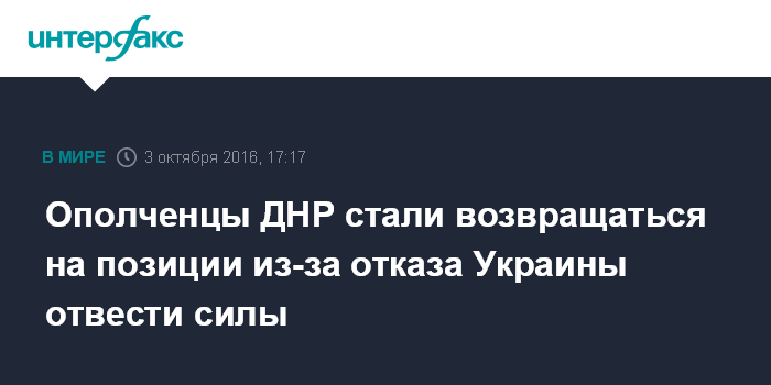 Москва. 3 октября. INTERFAX.RU - Ополченцы самопровозглашенной Донецкой народной республики (ДНР), отведенные из района села Петровское, возвращаются на свои позиции из-за отказа украинских военных отвести свои силы, заявил журналистам замкомандующего Минобороны ДНР Эдуард Басурин.