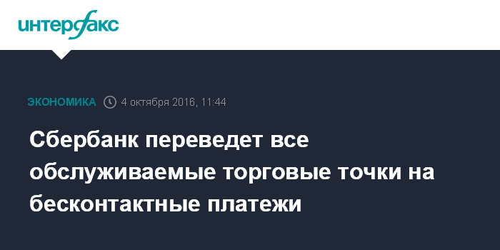 Москва. 4 октября. INTERFAX.RU - Сбербанк планирует до конца 2017 года перевести все обслуживаемые им торговые точки на прием бесконтактных платежей, сообщила журналистам директор департамента торгового эквайринга Сбербанка Светлана Кирсанова.