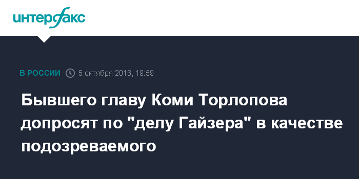 Бывшего главу Коми Торлопова допросят по "делу Гайзера" в качестве подозреваемого