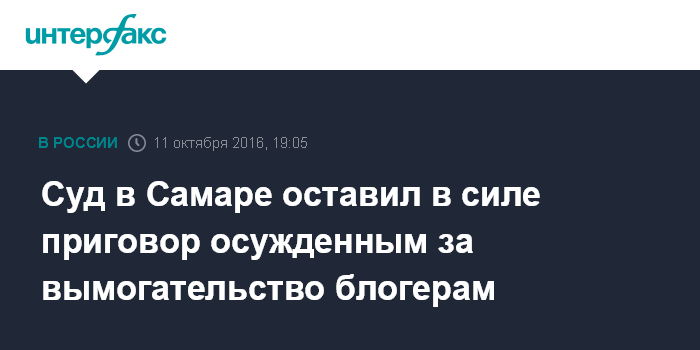 Москва. 11 октября. INTERFAX.RU - Самарский областной суд не стал пересматривать приговор по "делу блогеров", осужденных за вымогательство крупной суммы у местного бизнесмена.