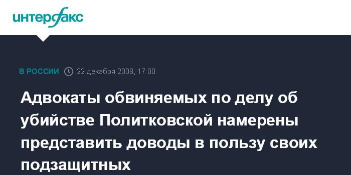 Москва. 22 декабря. INTERFAX.RU - Защита обвиняемых по делу об убийстве обозревателя "Новой газеты" Анны Политковской во вторник приступит к представлению доказательств невиновности обвиняемых в убийстве журналистки.