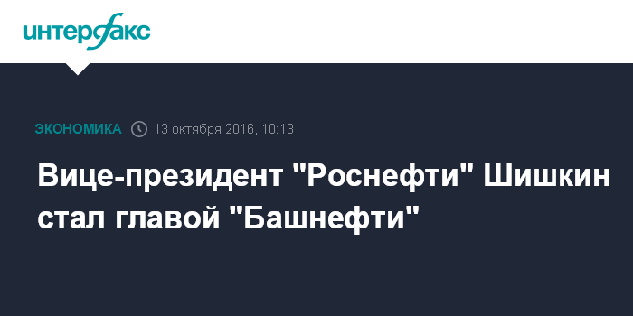 Москва. 13 октября. INTERFAX.RU - Совет директоров "Башнефти" назначил новым президентом, председателем правления компании вице-президента "Роснефти" Андрея Шишкина, говорится в сообщении, размещенном на сайте "Башнефти".