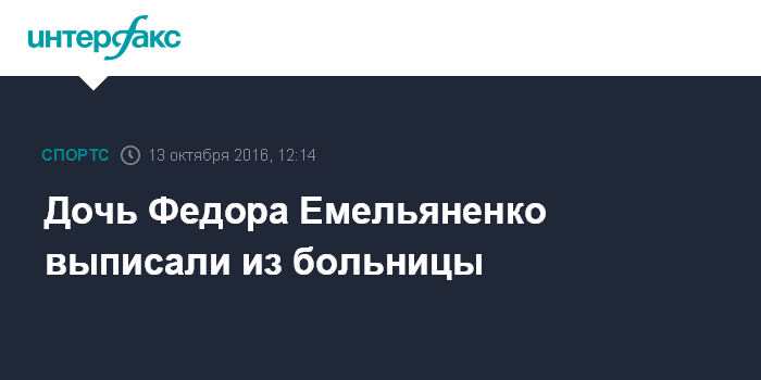 Москва. 13 октября. INTERFAX.RU - Шестнадцатилетняя дочь спортсмена Фёдора Емельяненко Мария покинула больницу в Москве, где ей была оказана медицинская помощь после избиения, сообщил "Интерфаксу" в четверг источник, знакомый с ситуацией.