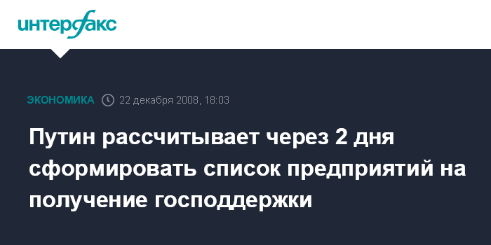 Москва. 22 декабря. INTERFAX.RU - Список крупнейших предприятий, которые должны получить государственную поддержку, должен быть сформирован в ближайшие два дня. Такую задачу поставил перед членами правительства глава кабинета Владимир Путин.