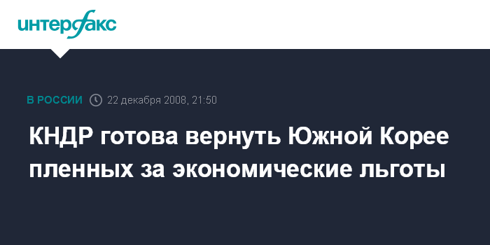Москва. 22 декабря. INTERFAX.RU - Пхеньян проинформировал Сеул о желании вернуть на Юг несколько южан, плененных во время Корейской войны 1950-53 гг., а также нескольких гражданских лиц в обмен на экономические льготы, пишет южнокорейская газета "Чунган ильбо" со ссылкой на близкий Северной Корее источник, пожелавший остаться неназванным.