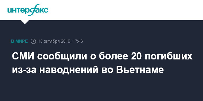 Москва. 16 октября. INTERFAX.RU - По меньшей мере 21 человек погиб в результате наводнений, настигнувших на этой неделе несколько центральных провинций Вьетнама, сообщают в воскресенье местные СМИ.