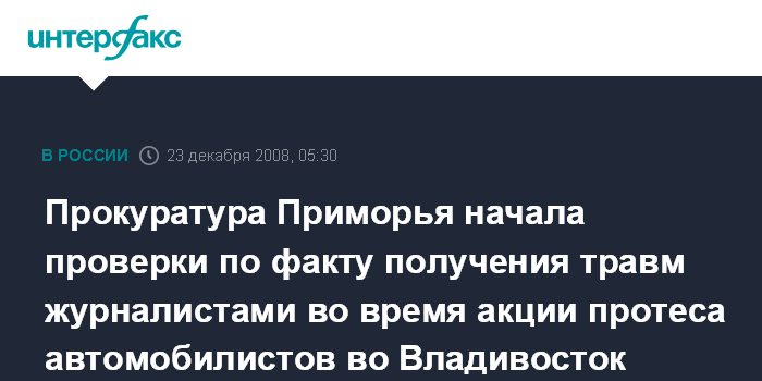 Как сообщалось ранее, приморская общественная организация журналистов "Восток" выступила с открытым обращением к руководству краевого УВД с требованием провести расследование по поводу задержания и нанесения травм журналистам, которые освещали акцию протеста автомобилистов.