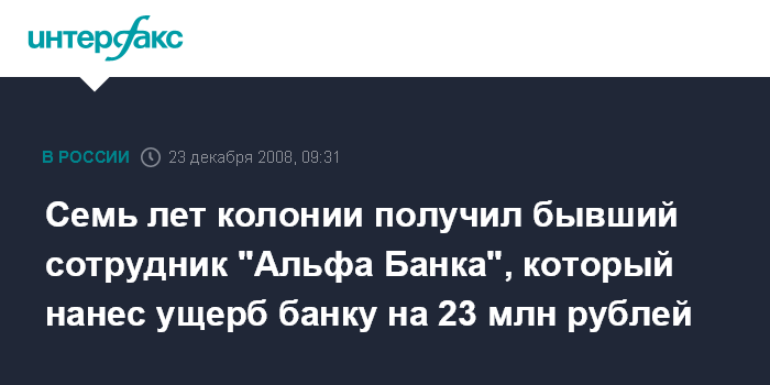 Семь лет колонии получил бывший сотрудник "Альфа Банка", который нанес ущерб банку на 23 млн рублей