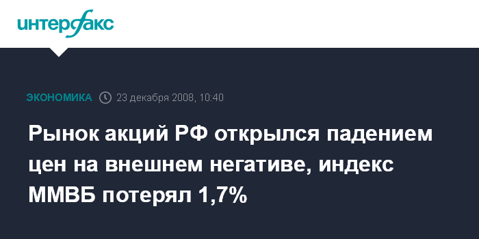 Москва. 23 декабря. INTERFAX.RU - Российский рынок акций открылся во вторник падением цен на внешнем негативе (подешевела нефть, снизились мировые фондовые площадки), индекс ММВБ за минуту торгов потерял 1,7%.