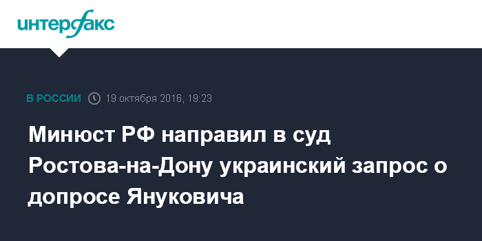 Москва. 19 октября. INTERFAX.RU - Минюст РФ направил в Советский суд Ростова-на-Дону запрос Украины о допросе бывшего президента страны Виктора Януковича и бывшего командующего внутренними войсками Станислава Шуляка.