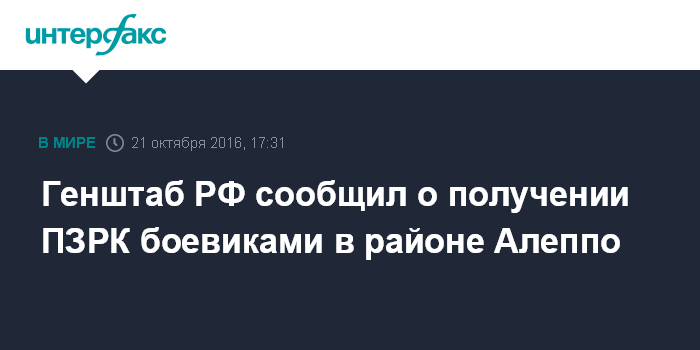 Москва. 21 октября. INTERFAX.RU - У боевиков в районе Алеппо появились переносные зенитные ракетные комплексы (ПЗРК), сообщил в пятницу начальник главного оперативного управления Генштаба ВС РФ генерал-лейтенант Сергей Рудской.