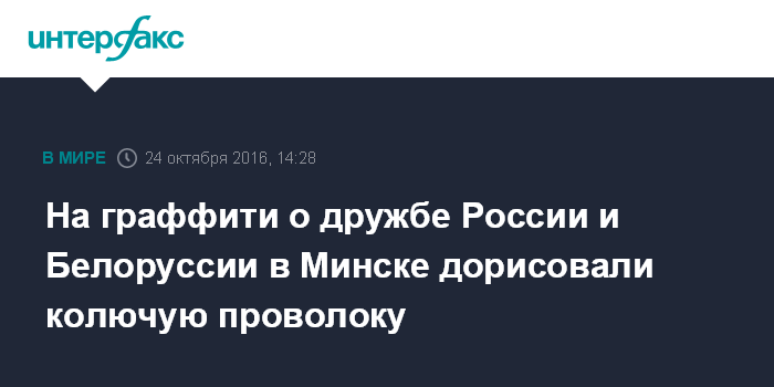 Москва. 24 октября. INTERFAX.RU - Неизвестный художник дорисовал колючую проволоку на символизирующем дружбу России и Белоруссии граффити в Минске, сообщают белорусские СМИ в понедельник.
