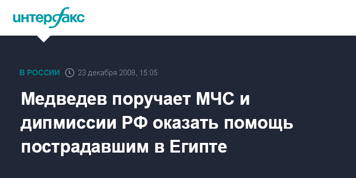 Москва. 23 декабря. INTERFAX.RU - Президент РФ Дмитрий Медведев поручил МЧС и посольству России в Египте оказать всю необходимую помощь россиянам, пострадавшим в аварии автобуса в Египте, сообщила журналистам во вторник пресс-секретарь главы государства Наталья Тимакова.
