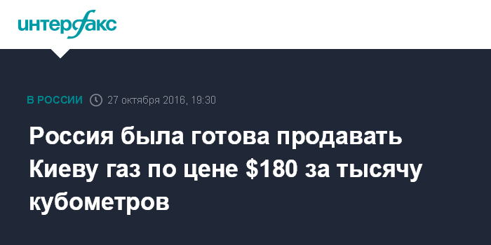 Москва. 27 октября. INTERFAX.RU - Россия готова продавать Украине газ по цене $180 за 1 тысячу кубометров, сообщил президент РФ Владимир Путин на пленарном заседании международного дискуссионного клуба "Валдай".