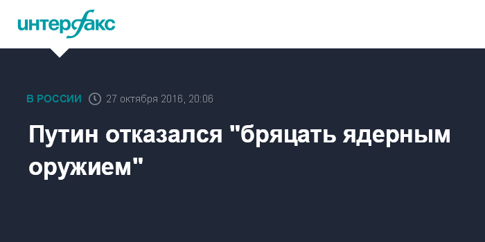 Москва. 27 октября. INTERFAX.RU - Бряцание ядерным оружием - самое последнее дело, вместе с тем нельзя рассматривать это оружие как фактор потенциальной агрессии, считает президент РФ Владимир Путин.