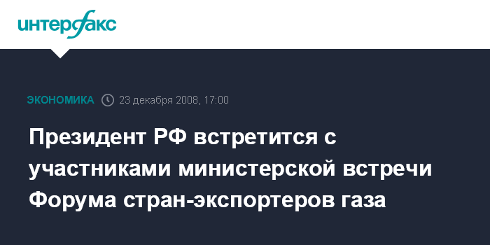 Москва. 23 декабря. INTERFAX.RU - Президент РФ Дмитрий Медведев встретится во вторник вечером с участниками проходящей в Москве седьмой министерской встречи Форума стран-экспортеров газа (ФСЭГ).