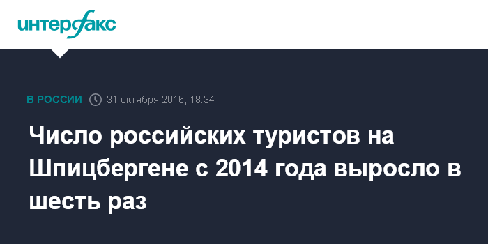 Москва. 31 октября. INTERFAX.RU - Число российских туристов на архипелаге Шпицберген в Баренцевом море за последний год выросло втрое, а с 2014 года - в шесть раз, со 100 до 600 человек. Об этом сообщил глава центра арктического туризма "Грумант" при государственном тресте "Арктикуголь" Тимофей Рогожин.