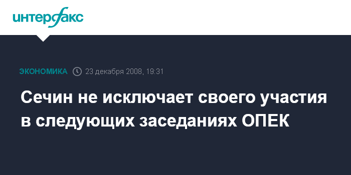Москва. 23 декабря. INTERFAX.RU - Вице-премьер правительства России Игорь Сечин не исключает своего участия в заседаниях ОПЕК в январе и марте следующего года.