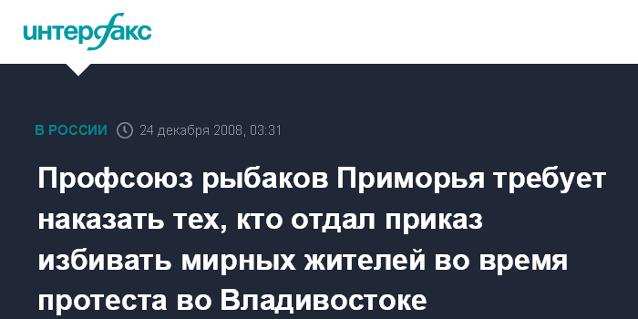 Владивосток. 24 декабря. ИНТЕРФАКС-ДАЛЬНИЙ ВОСТОК - Профсоюз рыбаков Приморья от имени всех работников отрасли в регионе направил в адрес руководства страны телеграмму с требованием наказать виновных в жестком разгоне мирного протеста на центральной площади Владивостока в воскресенье.
