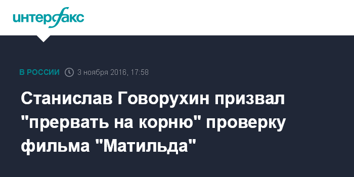 Москва. 3 ноября. INTERFAX.RU - Председатель комитета Госдумы по культуре, кинорежиссер Станислав Говорухин считает, что идею проверки фильма "Матильда" Алексея Учителя нужно "прерывать на корню". Об этом сообщается в четверг на сайте комитета.