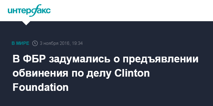 Москва. 3 ноября. INTERFAX.RU - ФБР уже больше года ведет расследование в отношении некоммерческого фонда семьи Хиллари Клинтон Clinton Foundation и собрало большое количество доказательств, вскоре могут быть предъявлены обвинения, сообщает в четверг телеканал Fox News.