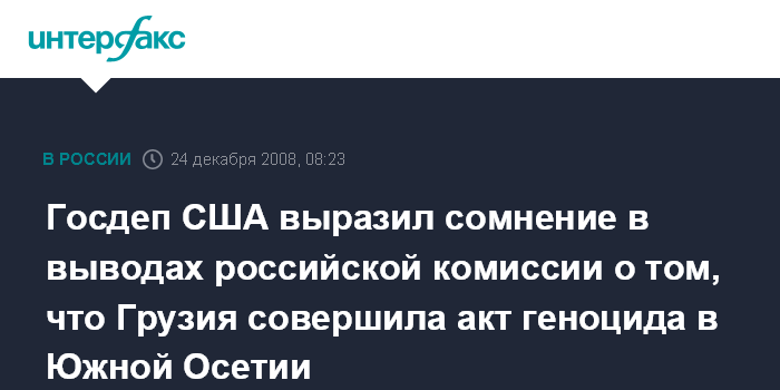Москва. 24 декабря. INTERFAX.RU - В Вашингтоне выражают сомнения в точности оценок российской комиссии, признавшей действия Грузии в Южной Осетии геноцидом, заявил во вторник пресс-секретарь госдепа США Шон Маккормак.