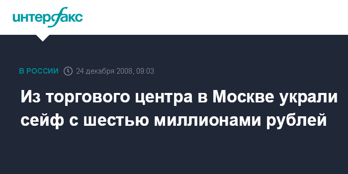 Москва. 24 декабря. INTERFAX.RU - В Москве из торгового центра на проспекте Вернадского похитили около 6 млн рублей, сообщил в среду "Интерфаксу" источник в правоохранительных органах.
