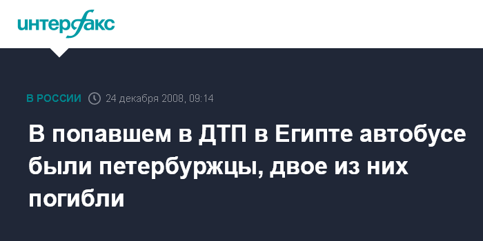 Пресс-секретарь Российского союза туриндустрии (РСТ) Ирина Тюрина сообщила "Интерфаксу", что авария произошла в понедельник около 23:30 мск недалеко от египетского города Дахаб на Суэцком полуострове.