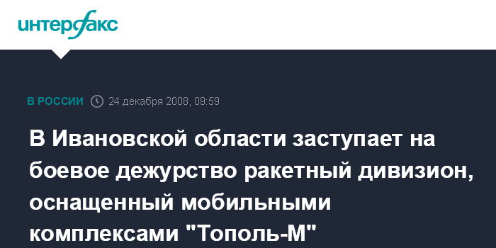 Москва. 24 декабря. INTERFAX.RU - Перевооружение Тейковской дивизии Ракетных войск стратегического назначения (РВСН) на новые мобильные комплексы "Тополь-М" и РС-24 продолжится в 2009 г., сообщил в среду заместитель командующего РВСН генерал-лейтенант Владимир Гагарин.