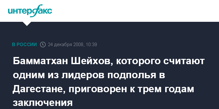 Москва. 24 декабря. INTERFAX.RU - К трем годам заключения в колонии общего режима приговорил Верховный суд Дагестана жителя республики Бамматхана Шейхова, которого следствие называло одним из лидеров дагестанского религиозного экстремистского подполья.