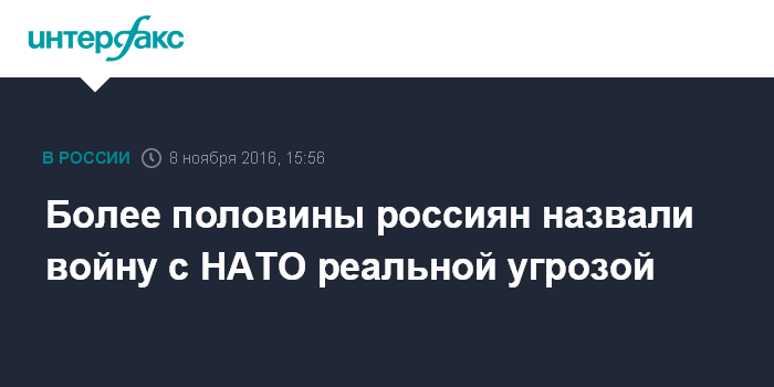 Москва. 8 ноября. INTERFAX.RU - Каждый второй (52%) россиянин считает, что сейчас существует реальная угроза масштабной войны между Россией и странами НАТО, не согласны с этим мнением 40% респондентов, сообщает фонд "Общественное мнение".