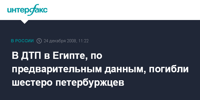 Москва. 24 декабря. INTERFAX.RU - В ДТП под Дахабом в Египте, по предварителным данным, погибли шестеро петербуржцев, сообщил "Интерфаксу" источник в ГУ МЧС по Петербургу.