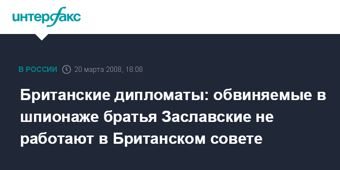 Москва. 20 марта. INTERFAX.RU - Братья Заславские, которых ФСБ РФ обвиняет в промышленном шпионаже, не являются сотрудниками Британского совета, заявляет посольство Великобритании в РФ.