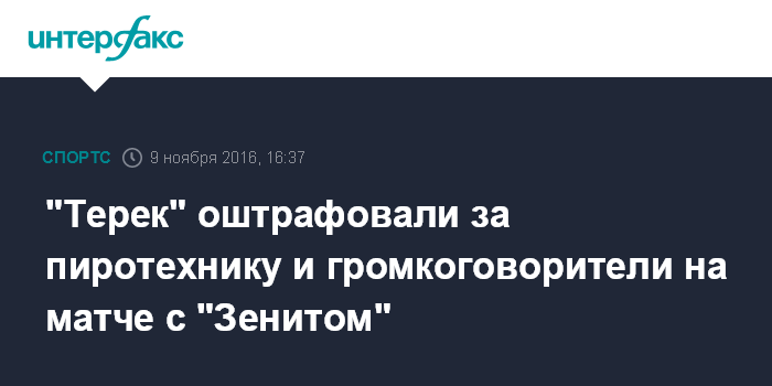 Москва. 9 ноября. INTERFAX.RU - Контрольно-дисциплинарный комитет Российского футбольного союза (КДК РФС) оштрафовал футбольный клуб "Терек" на 70 тыс. рублей за пиротехнику и использование громкоговорителя на матче с "Зенитом", сообщил журналистам председатель комитета Артур Григорьянц.
