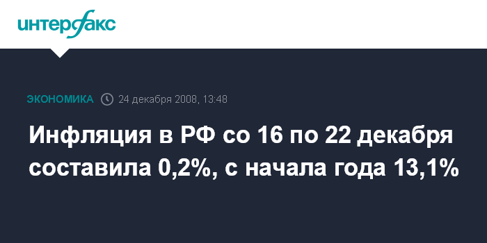 Москва. 24 декабря. INTERFAX.RU - Инфляция в РФ за период с 16 по 22 декабря составила 0,2%, сообщил "Интерфаксу" источник в одном из ведомств финансово-экономического блока со ссылкой на данные Росстата.