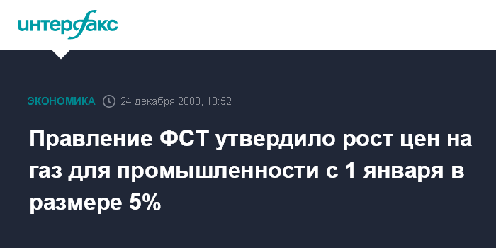 Москва. 24 декабря. INTERFAX.RU - Правление Федеральной службы по тарифам (ФСТ) на заседании в среду утвердило рост оптовых цен на газ для промышленности с 1 января в размере 5%, сообщил "Интерфаксу" источник, присутствующий на заседании.