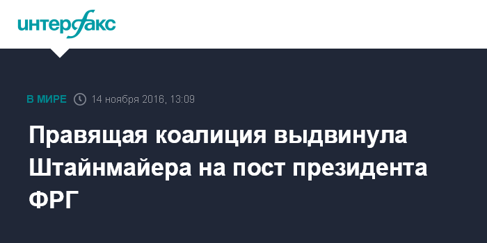 Как сообщалось, Штайнмайер пользуется большой популярностью у немцев, однако правящая коалиция в течение долгого времени не могла прийти к согласию относительно кандидатуры на пост главы государства.