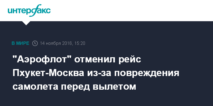 Москва. 14 ноября. INTERFAX.RU - "Аэрофлот" отменил в понедельник рейс Пхукет - Москва из-за повреждения самолета перед вылетом, сообщил "Интерфаксу" представитель перевозчика.