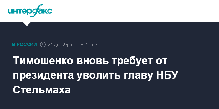 Москва. 24 декабря. INTERFAX.RU - Премьер-министр Украины Юлия Тимошенко потребовала от президента Украины незамедлительно уволить Владимира Стельмаха с поста главы Национального банка Украины (НБУ).