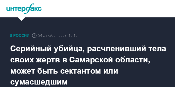 Москва. 24 декабря. INTERFAX.RU - Преступник, совершивший в городе Новокуйбышевске Самарской области тройное убийство и подбросивший кисть одной из жертв в местную церковь, - сектант или сумасшедший, заявил руководитель следственного управления СКП РФ по Самарской области Виталий Горсткин.